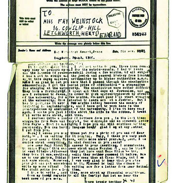 It is quite along time, I did not write to you. I have been really very busy to prepare myself for the metric examination. I had to learn all the classes of grammar scholl during a few months. Of all subjects, I had a lot to study: all the Jewish and general history from 1500 BCE up to this days, algebra, arithmetics up to higher mathematics, and so on. Now I am glad to let you know that I passed through the examination successfully. I got the second price of distinction – a stependium for studying at the university. The examinations were rather difficult. They took a forthnight. I spent all that days at Jerusalem, and now I returned to Yavne, in order to work agricultural work by direction of the university, for a few months. אי"ה next year I’ll start studying at the university. I had intented to learn now at a Yeshiva. But I had to postpone it unto a few months later, because the season of incubating is beginning now, and I have got to work here in the poultry-house by assignment of the university. I like it here very much. I wrote you just little about the life in the kibbuz. I trust I’ll write more about, next time.